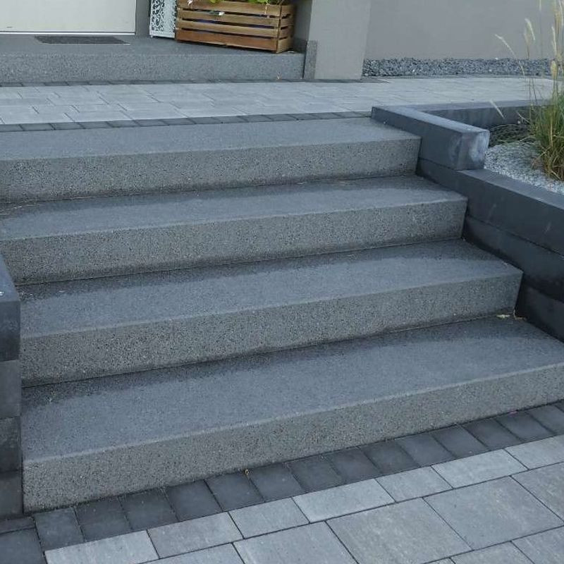 Blockstufen aus Granit Alvaro, Farbe anthrazit - dunkelgrau - blaugrau, 18 cm hoch, 40 cm Auftritt. Feinkörniger Granit, alle Seiten gesägt und alle 6 Flächen geflammt, mit Fase ringsum. Standardlängen von 50 cm - 350* cm. Andere Größen und Formate sowie Blockstufen mit Radius auf Anfrage. Der Granit Alvaro ist sehr feinkörnig und homogen. Leichte, nicht beeinflussbare Einschlüsse und Adern können bei diesem Naturstein vor allem bei größeren Bauteilen auftreten. Granit Alvaro wird hauptsächlich für Natursteinarbeiten im Außenbereich ab einer Stärke von 3 cm verwendet. Granit Alvaro hat bei Anlieferung einen grauen Farbton, die endgültige Farbe erreicht Granit Alvaro ca. 4 - 6 Wochen nach dem Einbau, Granit Alvaro ist säurebeständig, frostbeständig und rostfrei. Dieser Granit wird mit geflammter Oberfläche hergestellt, wodurch die Struktur und die Farbe des Steins am besten zur Geltung kommen. Andere Oberflächenbearbeitungen sind möglich. Granit Alvaro mit polierter Oberfläche wird auch im Innenbereich verwendet. Granit Alvaro ist ein Natursteinprodukt und unterliegt natürlichen Farb- und Kornabweichungen. Der Preis zu diesem Artikel ist gültig ab Werk Portugal bei genannter Mindestbestellmenge. Sollten Sie weniger benötigen, klicken Sie auf den blauen Botton Preisanfrage. Sie bekommen schnellstens ein kostenloses Angebot. Wir beraten Sie gerne auch telefonisch. Rufen Sie uns an +49 7761 93790460, aus der Schweiz +41 32 5132833.