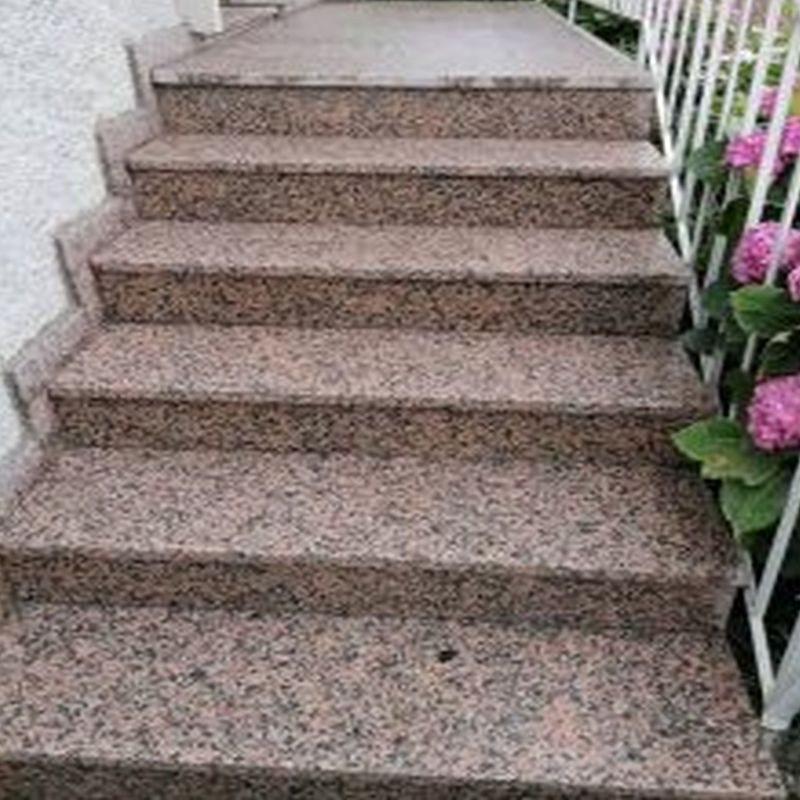 Trittstufen aus Granit Laahs, Farbe Rot bis lachsrosa. Mittelkorn bis Grobkorn, 4 cm stark 30 cm Auftritt alle Seiten gesägt und alle 6 Flächen geflammt, mit Fase ringsum. Individuelle Längen, Größen und Trittstufen mit Radius auf Anfrage. Passgenaue Gehrungsschnitte auf Anfrage möglich. Laahs Granit ist ein mittelkörniger bis grobkörniger, roter bis rosafarbener Granit aus Nordportugal. Wir bieten diesen Granit mit geflammten Sichtflächen an. Andere Oberflächenbearbeitungen wie gestockt oder sandgestrahlt sind auf Anfrage möglich. Der Granit Laahs ist in seiner Rotfärbung sehr variabel und teilweise sehr lebhaft. Die endgültige Farbe erhält der Stein erst ca. 4 - 6 Wochen nach der Verlegung, wenn die Kapillarkräfte des Gesteins wieder hergestellt sind. Dieser Granit eignet sich für Natursteinarbeiten im Außenbereich ab einer Steinstärke von 3 cm. Laahs Granit ist säure-, frost- und rostbeständig. Der Preis zu diesem Artikel ist gültig ab Werk Portugal bei genannter Mindestbestellmenge. Sollten Sie weniger benötigen, klicken Sie auf den blauen Botton Preisanfrage. Sie bekommen schnellstens ein kostenloses Angebot. Wir beraten Sie gerne auch telefonisch. Rufen Sie uns an +49 7761 93790460, aus der Schweiz +41 32 5132833.