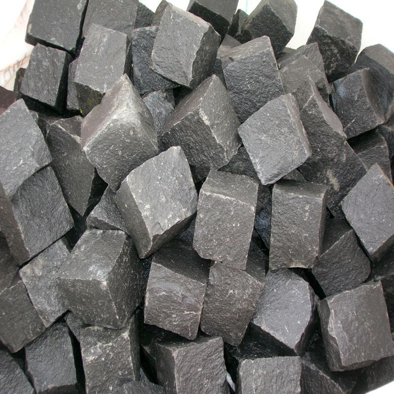 Gespaltenes Pflaster aus Granit Adrian Black. Tiefschwarze Farbe. Feinkörniges Granitpflaster zum Verlegen in Reihen oder Bögen. Maschinen gespaltene Granitpflastersteine, maßhaltig nach DIN EN 1341, lose Verladung auf Kipper, bei kleineren Mengen Verladung in Big Bag.